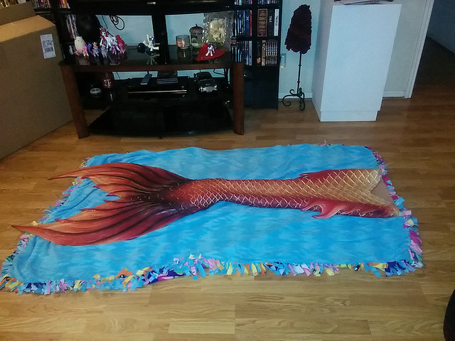 As for my tail, it's a perfect fit. The only big problem is that it's too long in the front. While my big ass is fully covered, it's over my belly button and it bothers me because it wrinkles way too much (which is normal I know) but I'm a perfectionist so I think I'm gonna cut the top a little, maybe a slight V-shape like Ariel. The blending colors for my waist line are not really working (it's not as good as Syrena's waist line colors) so I think I will use a white scarf as a merman belt to cover it. It's a bummer but it's okay. Although if I had known earlier, I wouldn't have asked a blended waist line. Nevertheless, I still love my tail :)