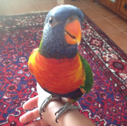 Attachment 36390 My rainbow lorikeet, Paulie. We rescued him from my high school because some crows were attacking him and he was stunned. We were told that if we took him into the vet, they would have to put him down because apparently, rainbow lorikeets are considered vermin here in Western Australia. He was timid when we first got him but now he loves attention. :) He likes to sit on your shoulder and 'preen' your hair. :) He also likes to nibble on your ear. He is a complete butt but he is a lovely bird :lol: