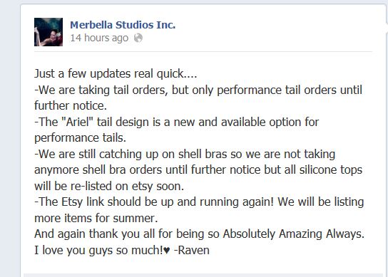 But one thing is bothering me;it seems like every week there is something new that's getting the front line instead of working on a tail (or mine) => mermaid bra's, loads of new products in the making. etc etc. and now i get the feeling I will never see my tail or she'll just send it out and what if i don't like the colors? I'm just so worried :'(