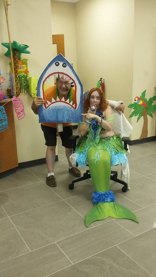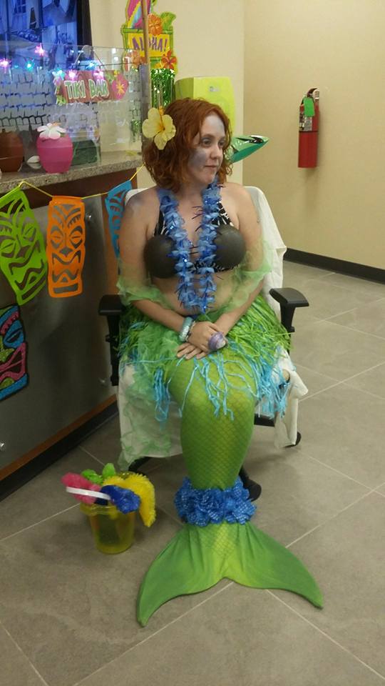 So yesterday was an awesome day for me ^.^ My mother works as a dispatcher for a local trucking company called Melton. Well the company had a contest going on and it was to decorate your office with a Hawaiian/summer theme. When my mom called and told me about it my first reaction was "I bet you'd win of you had a mermaid at your desk,". She liked the idea and so Friday morning at 7 I was dressed up and having fun. So many of the co-workers kept coming down and wanting to get pictures. A lot of new drivers were there as well and I can't help but wonder what was going through their minds that day lol!!