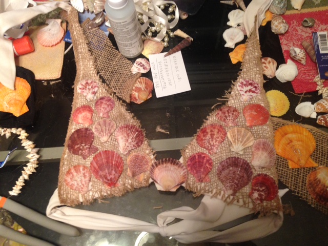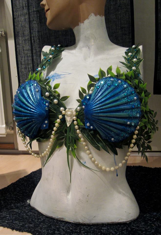 I've been working on designing mine but keep running into trouble. I started using an old bikini top but once I glued shells to it, the top became much less stretchy and flexible so that it wasn't covering up as much as it should! Unfortunately I had to remove the shell in the middle between the cups so that it could be more flexible, but this is essentially what my current top is looking like.