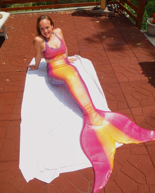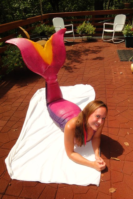 I will post a separate review with closer-up detail pictures of my tail and top, but here are pictures of my new tail from Mermaid Parties! Yes, I created the design of the colors and everything! I have swam in it twice already and it is AMAZING!!! The first time I swam, I went alone, so no one to take pictures, and the second time I was with one of my bestest mer-friends, but it was a nighttime swim under the stars, so pictures wouldn't have shown up well :D! Anyway, here it is, out of water!
