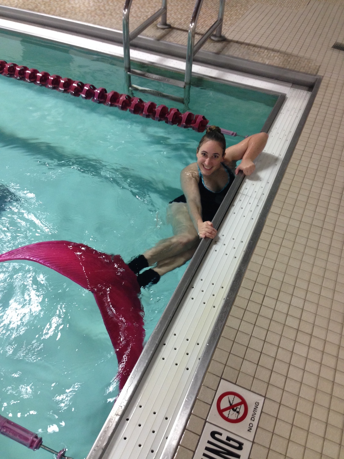 I was able to take it to the pool at my university tonight and the student lifeguards were so excited to see it. One of the lifeguards was actually one of my former students so that made for a pretty funny conversation. I only swam with the fluke tonight because I wanted to get used to it and make sure I could swim well enough before I added the tail. It was a great success. I was even able to take it into the diving well and play around for a while after I got use to it in the lap lanes.
