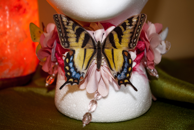 Currently these wings are mounted on a soft, stretch lace armband. I will also be introducing a line mounted on metal filigree armcuffs. And I'm planning a mermaid line of armbands with flying fish, rays, eels, and other sea creatures. Also coming in the next few days and weeks: faerie choker necklaces with realistic butterflies, frogs, and other critters, and faerie headdresses with flowers and butterflies. I will be adding to my line of neoprene sea creatures, too.
