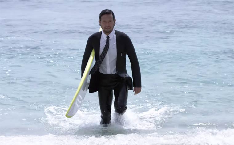 Haha the Japanese can get away with this but most surfers would consider this a "kook of the day" look (known from Instagram parody account @kookoftheday who makes fun of surfers who try too hard to look cool, esp ones that wear their wetsuit all day and get "yeasty"). Fun fashion concept but not very practical for surfing at least.