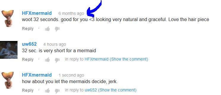 Seriously, 6 months later you need to point out you don't agree that 32 seconds is nice? you wear a mermaid tail and keep yourself on the bottom of the pool for 32 seconds loser -_-