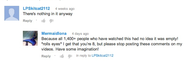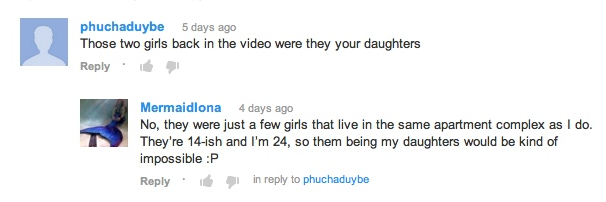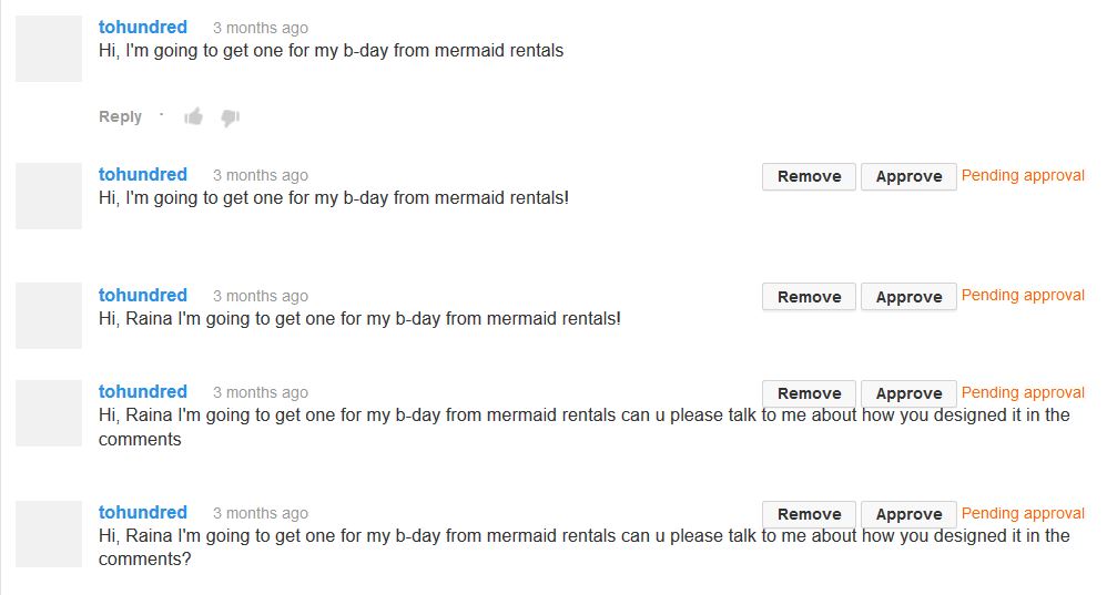 On this same video I get about 50 "CAN I HAVE YOUR OLD TAIL" and about 50 "SHOW US YOU SWIMMING IN IT" -_- cuz you know, no one can click the link to see the rest of the videos....